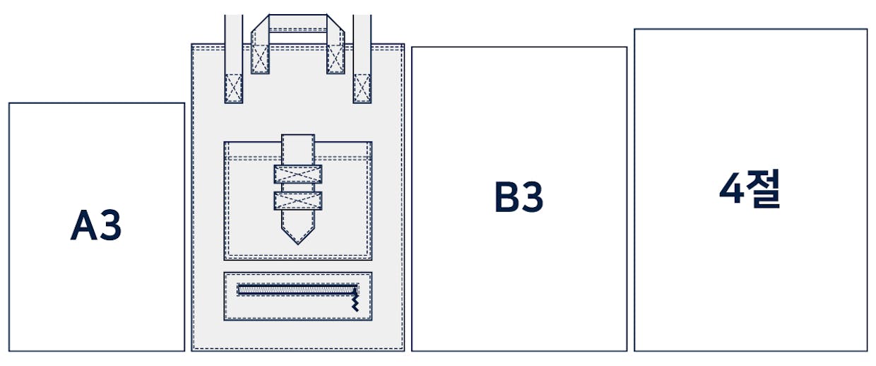 A3백의 사이즈는 가로 36cm, 세로 52cm, 폭 10cm 입니다. A3파일의 크기나 두께를 고려해도 편안하게 넣을 수 있고, 가방입구에 있는 자석잠금장치를 활용할 수 있게 제작되었습니다. 가방의 폭이 10cm라 A3파일 2개까지는 편안히 넣으실 수 있어요. B3와 4절 사이즈의 경우 가방에 넣을 수는 있으나 입구의 자석 잠금장치는 사용은 불가합니다.