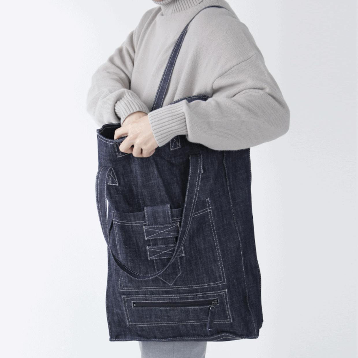 기시히는 환경에 해가 가지 않는 선에서 활동을 하리라 다짐했습니다만, 이 가방은 2015년에 디자인 한 가방으로 새 원단으로만 제작이 가능합니다. 디자인 특성상 청바지 자르고 이어 제작하기에는 최소한 바지가 3벌은 필요하고, 많이 무거워 지기 때문입니다. 또, 환경에 덜 해롭게 염색이 된 원단도 사용할 수 없을 것 같습니다. 이 가방에 적합한 원단은 뻣뻣하면서도 비교적 얇은 원단인데요. 저는 가방의 완성도를 위해 염색공법보다 가방에 더 적합한 원단을 찾아야 합니다.